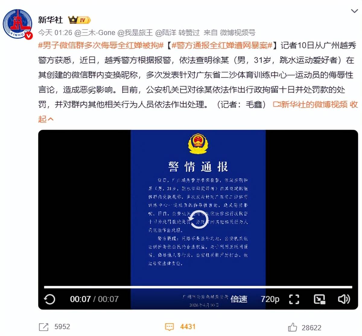 嬋寶的勇敢報警也讓大家對飯圈文化格外的重視,促進官方對運動員們的保護,果然短短幾天就有了結果。