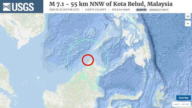 2026年2月23日馬來西亞的沙巴(Sabah)發生規模7.1強震,前中央氣象局地震測報中心主任郭鎧紋表示,本次屬于隱沒帶型深層地震,規模7以上地震平均約每30天出現一次,本次距離上次發生已過76天,可謂地震平靜期終結。至于台灣,2月23日在坪林剛好也發生規模4.0地震,後續可注意地震活動是否漸漸活躍。