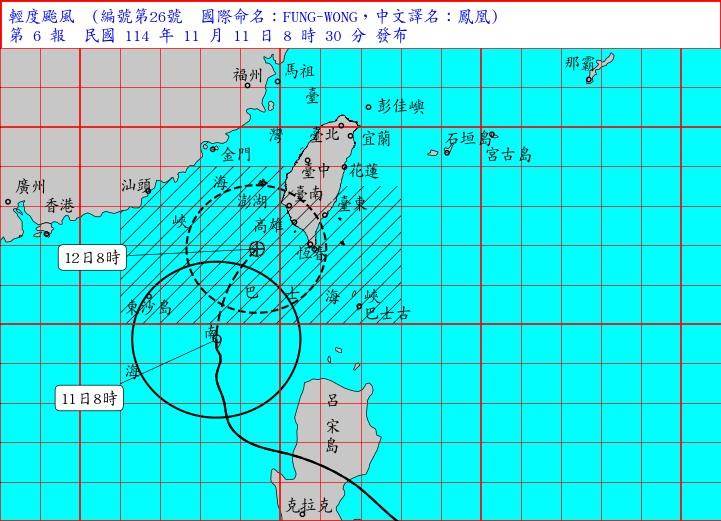 氣象署今日8時30分發布颱風警報單,颱風鳳凰已減弱為輕颱,11日8時的中心位置在北緯19.6度,東經118.4度,即在鵝鑾鼻的西南方約360公里之處,以每小時12公里速度,向北北東轉東北進行。暴風圈正逐漸進入台灣南方近海,對台南、高雄、屏東、台東、恆春半島將構成威脅,預計此颱風強度有持續減弱且暴風圈亦有縮小的趨勢。