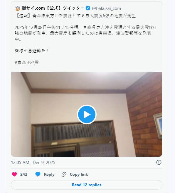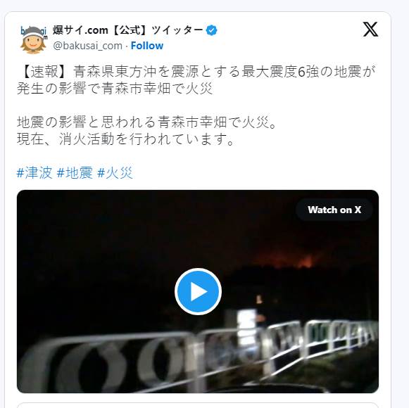 青森縣在當地時間8日深夜11時15分發生規模7.6強震,後下修至芮氏規模7.5,震源深度僅50公里,最大震度達6強。強震發生18分鐘後,又發生規模5.6地震。日本氣象廳針對北海道、青森縣、巖手縣發布海嘯警報,最大波高預估有3公尺,多地通報發生火災,今晨海嘯警報已解除。