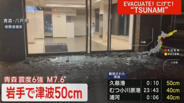 日本青森縣外海當地時間今(8)日晚間11時15分左右發生地震,規模7.6,11時33分又發生規模5.6地震,北海道、青森縣巖手縣等多地發布海嘯警報後,陸續測得海嘯襲來。東北地區至少4000戶停電,超市、住家也傳出災情。