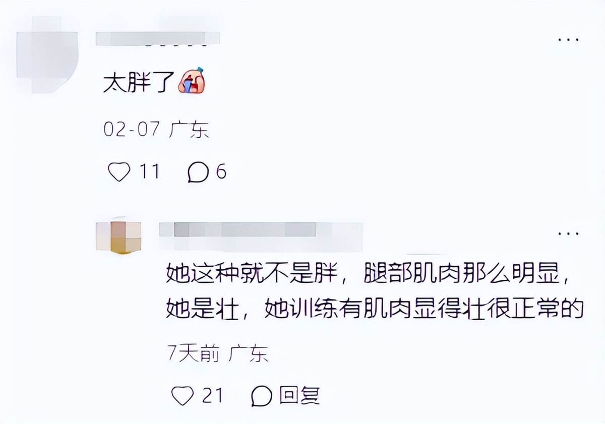 有人翻出她幾年前的比賽照片,對比著說她「越來越胖」「不自律」,還有人陰陽怪氣,說她「現在跳不動了,巔峰期早就過了」。
