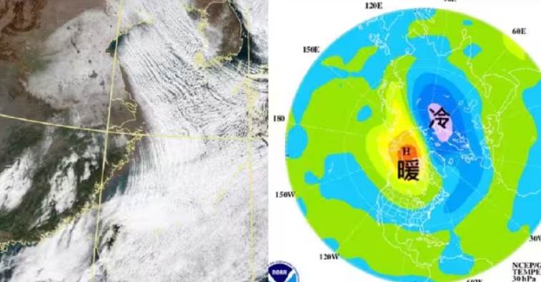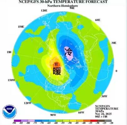 他進一步表示,冬季初期通常會有單一的冷空氣團以逆時針方式盤旋在北極圈高空,然而現在極渦應該發展的區域卻出現了暖空氣團,這基本上就是「極區平流層暖變」的跡象。