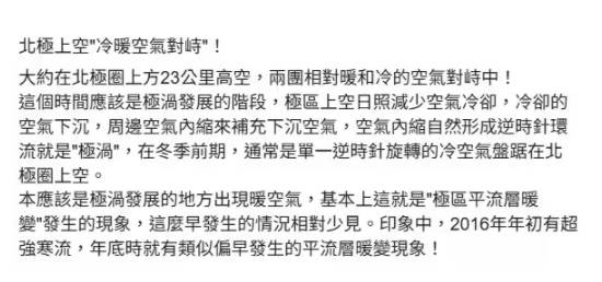 鄭明典特彆強調,這種現象如此早出現的情況並不常見,他印象深刻地記得,2016年初發生超強寒流時,在前一年底就有類似提早發生的平流層暖變狀況。圖片來源:臉書