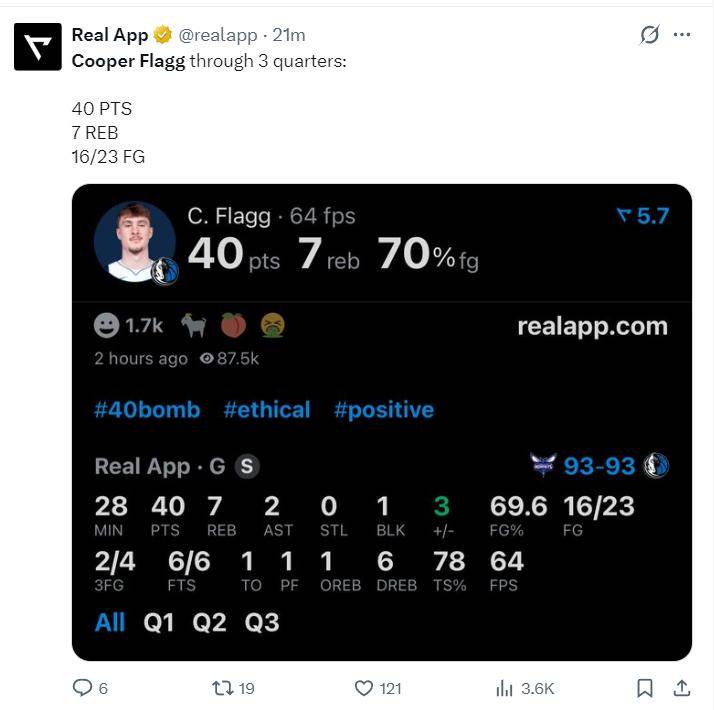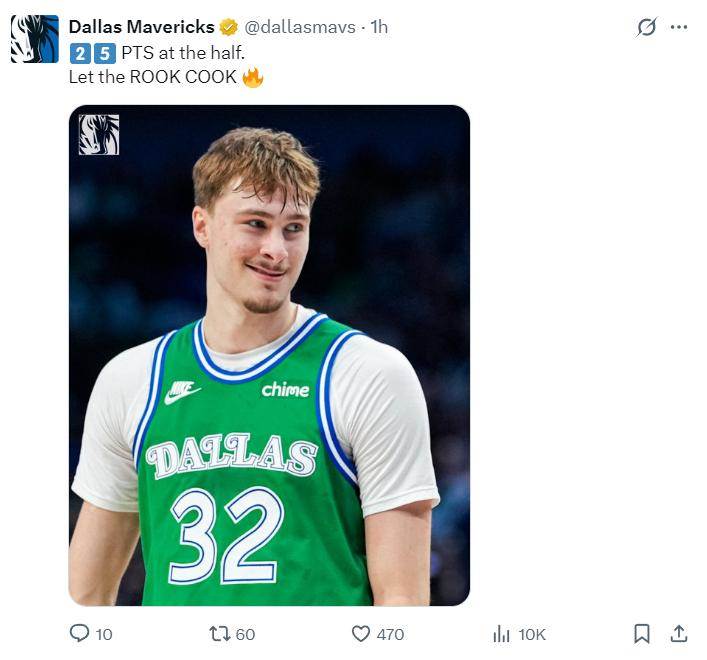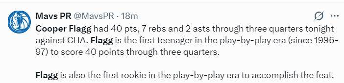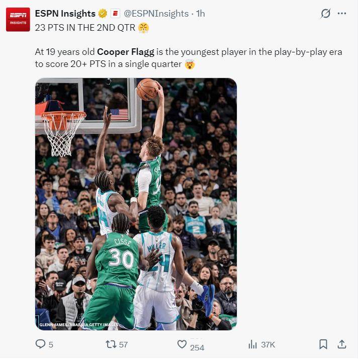 時間1月30日,獨行俠基石庫珀-弗拉格迎來了職業生涯之夜,他的得分刷新NBA生涯新高,全場比賽拿到49+10+3,這場比賽他一戰創造多項紀錄,尤其是第二節單節23分打出了前獨行俠基石東契奇的風采,只可惜最終出現致命失誤葬送比賽,獨行俠121-123惜敗黃蜂。
