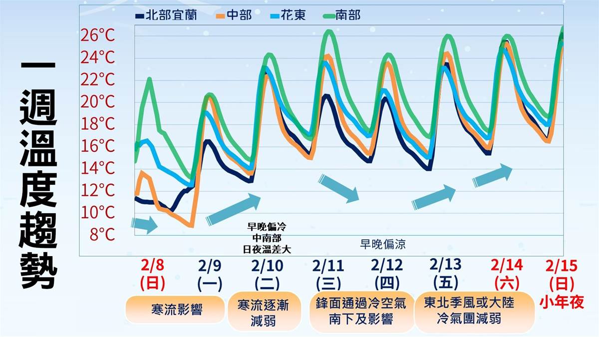 根據中央氣象署最新資料顯示,除夕(16日)當天東北季風增強,北部及東部地區將轉涼降溫。天氣風險也預測,春節將有兩波冷空氣接力南下,天氣節奏變化極快。前期以東北季風為主,未必出現大幅降溫,而春節後段冷空氣強度減弱,氣溫有望回升。
