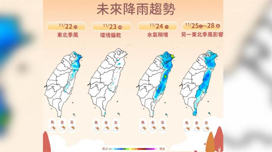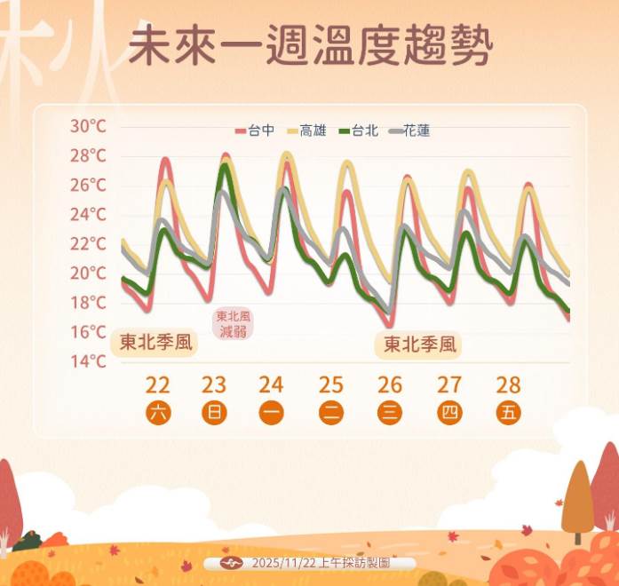 下週受多波東北季風增強影響,來的快去得也快,所以氣溫變化大,尤其西半部地區日夜溫差可達10度以上,早出晚歸者要多加保暖。