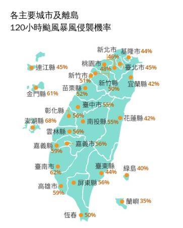 根據氣象署下午2時公佈的「120小時颱風暴風侵襲機率」,最高為澎湖縣68%,突破6成的還有金門縣61%、臺南市62%;超過5成的則有新竹縣50%、新竹市51%、苗栗縣52%、臺中市55%、南投縣55%、彰化縣56%、雲林縣56%、嘉義市56%、嘉義縣59%、高雄市59%、屏東縣56%、恆春半島50%,大臺北地區也有超過4成。