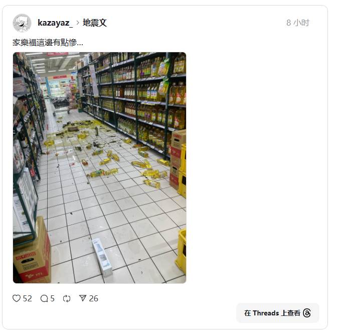 地震強烈搖晃,也造成新北市一處家樂福,多瓶油從貨架上掉落破裂灑滿地。