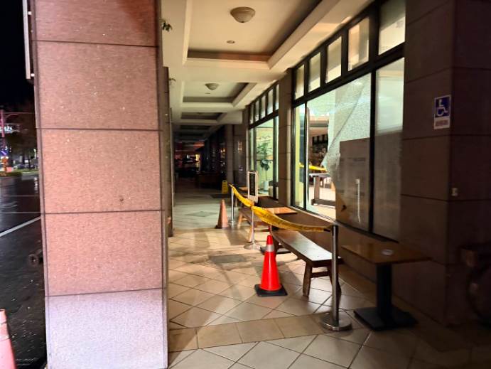 宜蘭礁溪山泉飯店,1樓大廳玻璃因地震破裂,目前現場已圍起封鎖線並擺放三角錐,提醒旅客留意。