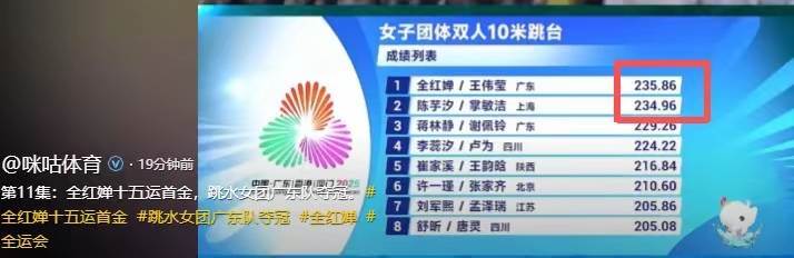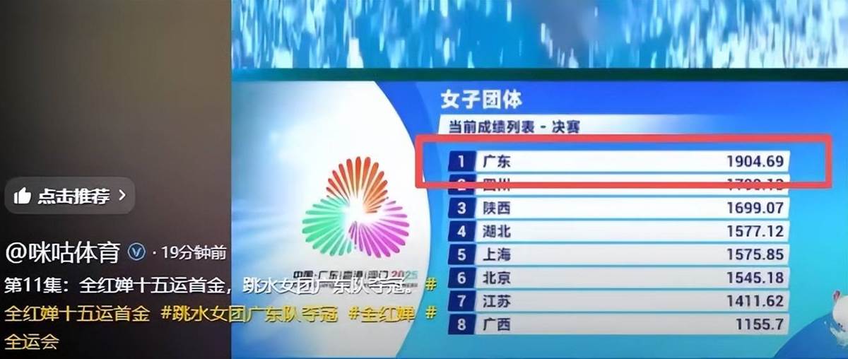 全紅嬋所在的廣東隊,也因為她和陳偉瑩的好成績,以及所有隊員的努力,拿下了1904.69的好成績,在團體決賽中遙遙領先。