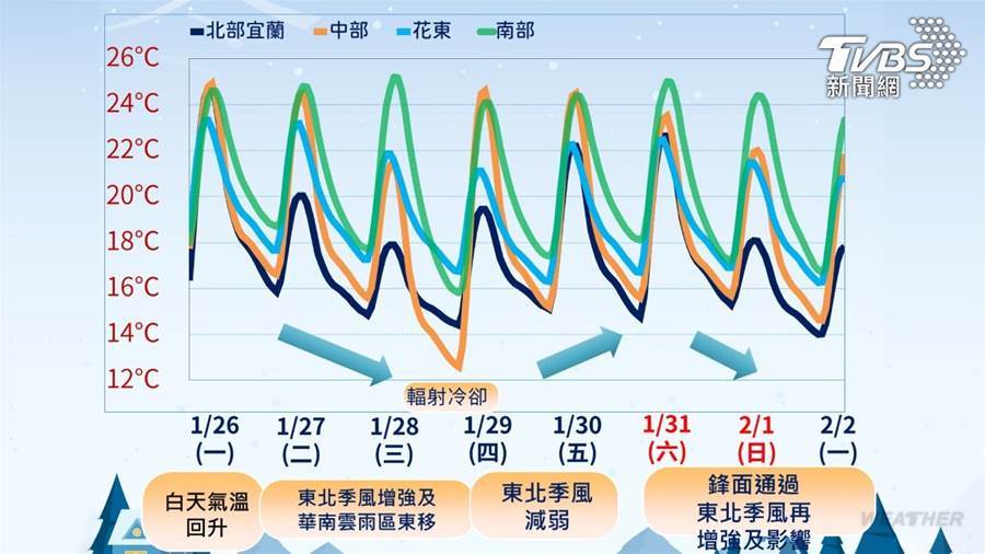 週三晚間到週四清晨,可能出現輻射冷卻作用,中北部、東北部都市低溫12至14度,空曠地區低溫10至12度或10度以下;南部、花東都市地區低溫14至16度,空曠地區12至14度,為本次冷空氣溫度最低的一段時間。