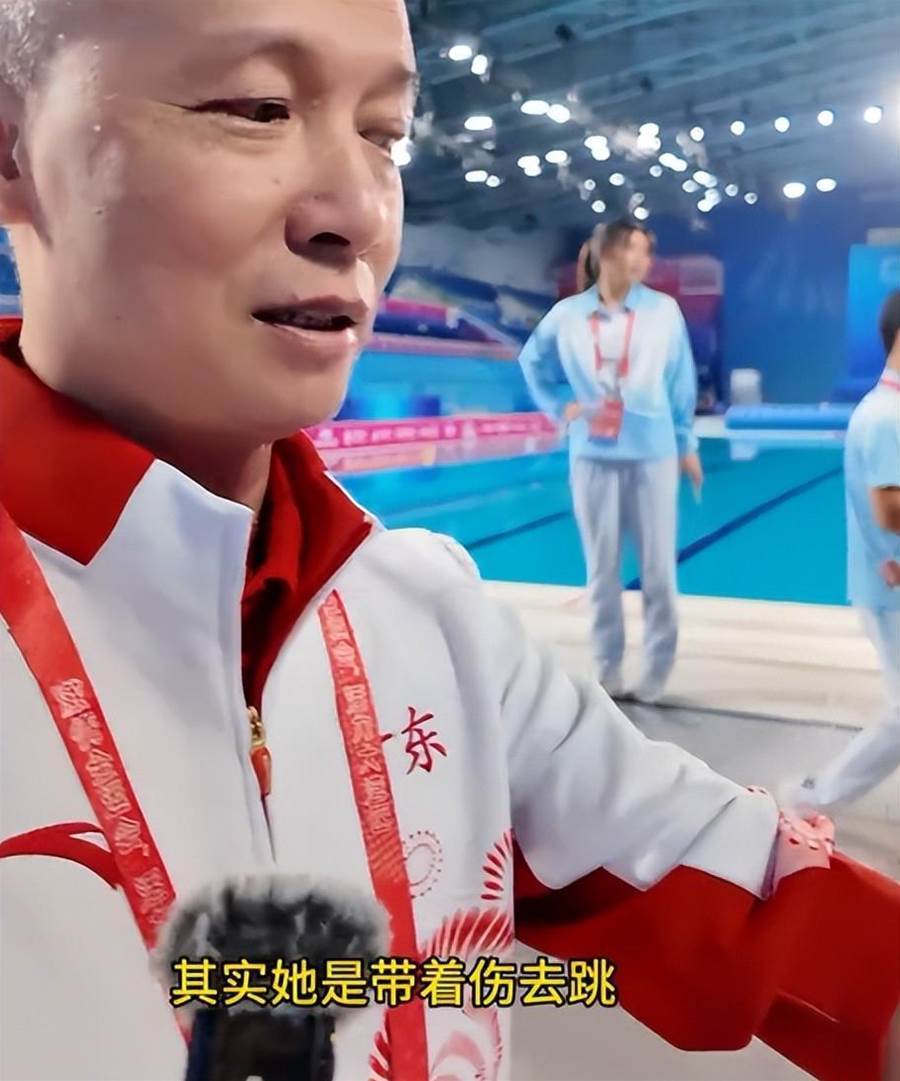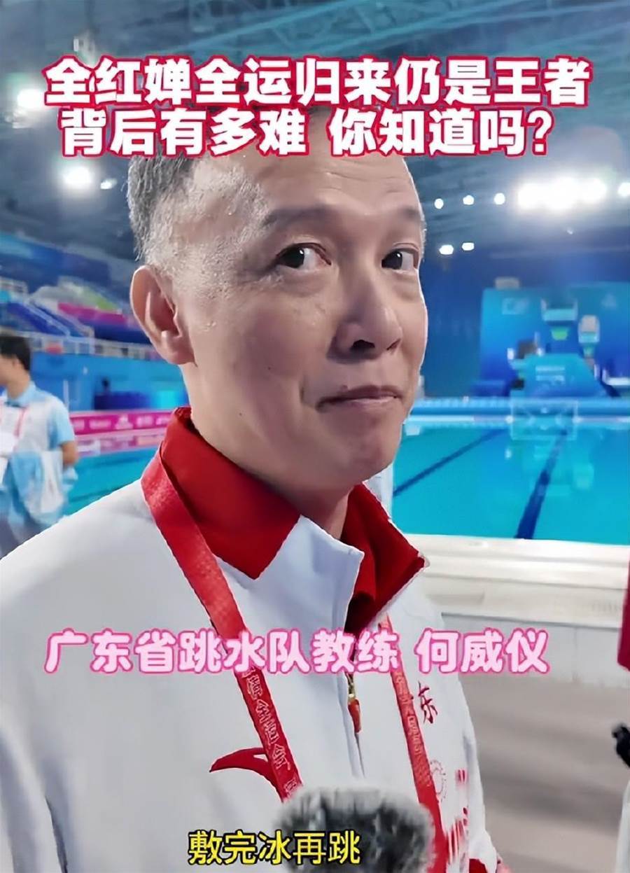 始終陪伴全紅嬋的教練何威儀並沒有讓全紅嬋接受採訪,而是自己簡單對全紅嬋的處境做了一個大概說明。