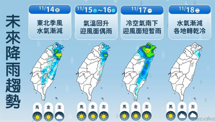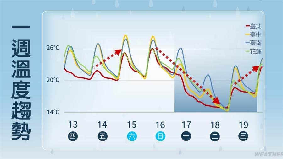 到了週末(15、16日)兩天,東北季風減弱,各地晴時多雲,東北部偶有零星少量降雨的機率;北台氣溫回升,中南部白天熱早晚涼。