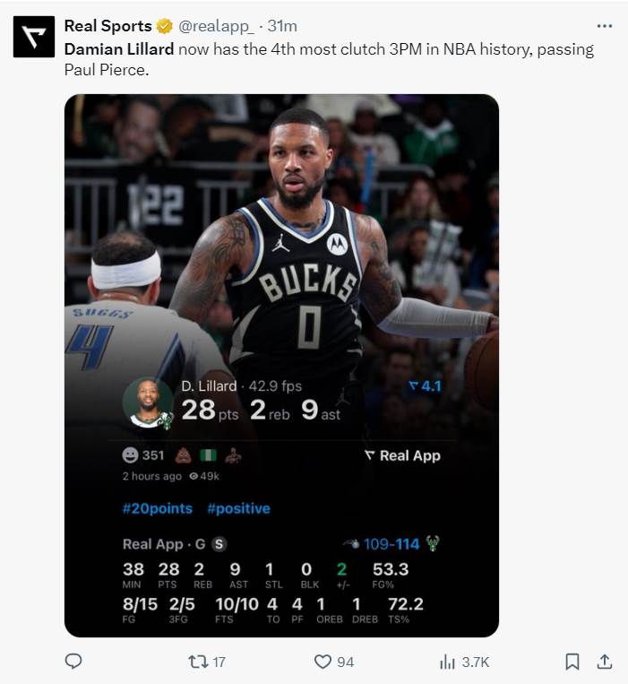 全場比賽利拉德38分鐘,15中8,三分5中2,罰球10中10,拿到28分9助攻2籃板1搶斷,命中率53.3%,真實命中率72.2%,他在關鍵時刻的三分命中數超越皮爾斯升至歷史第四完成里程碑。