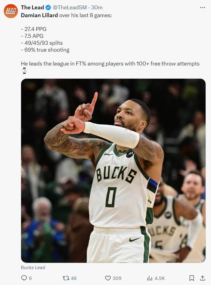 最近的8場比賽利拉德場均27.4分7.5助攻,命中率49%,三分命中率45%,罰球命中率93%,69%的真實命中率,在罰球100次的球員中利拉德罰球命中率第一。