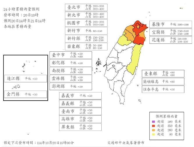 東北季風及風神颱風外圍環流影響,北部及東半部持續有大雨及豪雨,根據中央氣象署今天下午1時最新風雨預測,今天下午2時至明天下午2時,共有6縣市雨量達停班課標準。是否停班停課,以各縣市政府決策公布為準。