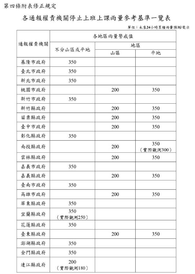 ▲停止上班上課雨量參考基準。(圖/取自人事行政總處網站)