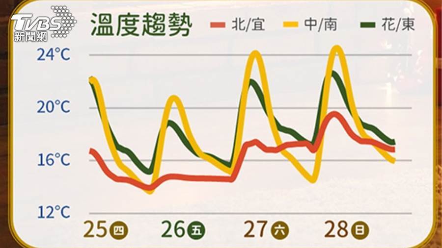 苗栗以北、花東高溫達20度;臺中以南21至25度。夜間各地低溫明顯,預估北部、東半部低溫14至16度,西半部因輻射冷卻,區域性12至14度,近山區10度或以下低溫。