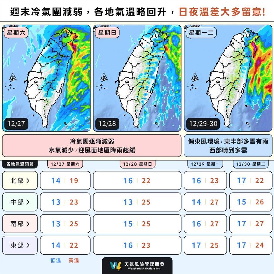 下週一和下週二,東北部、東部多雲,有短暫陣雨,其餘地區為晴到多雲天氣,北部東部稍回升至23度,西半部高溫約24至28度;夜間至清晨西半部有輻射冷卻,日夜溫差超過10度,民眾務必做好保暖。