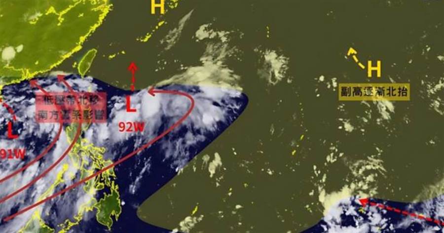 「觀氣象看天氣」指出,92W位在菲律賓東方,未來幾天隨低壓帶北移,會順著往北方移動,向北走的過程中,使台灣附近風向轉為偏西南風,使得台灣西南部、東南部水氣有增加的趨勢,2至3天後,可能來到「琉球—那霸」附近。