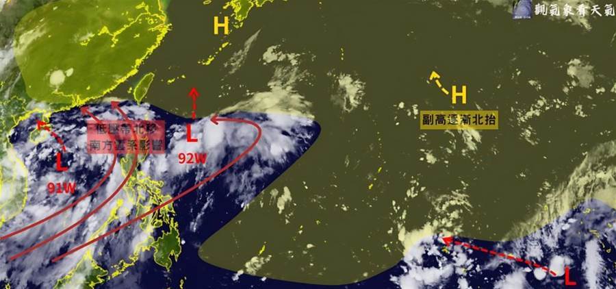 「觀氣象看天氣」以「熱帶擾動形成 低壓帶逐漸北上,午後雷雨漸增」為題指出,過去2天,在副高的籠罩之下,台灣各地天氣大多晴朗炎熱,這種穩定的天氣,從昨 (17) 日起稍微會有變化,西半部山區午後雷雨會增加至明 (19) 日南方低壓帶會逐漸北移,南方水氣接近台灣,白天高溫炎熱;今 (18) 日至明 (19) 日,隨91W逐漸北上,台灣附近轉吹偏西南風,水氣進一步增加,西南部清晨也有可能出現降雨,且午後雷雨會變得更旺盛、有往平地擴展的趨勢。