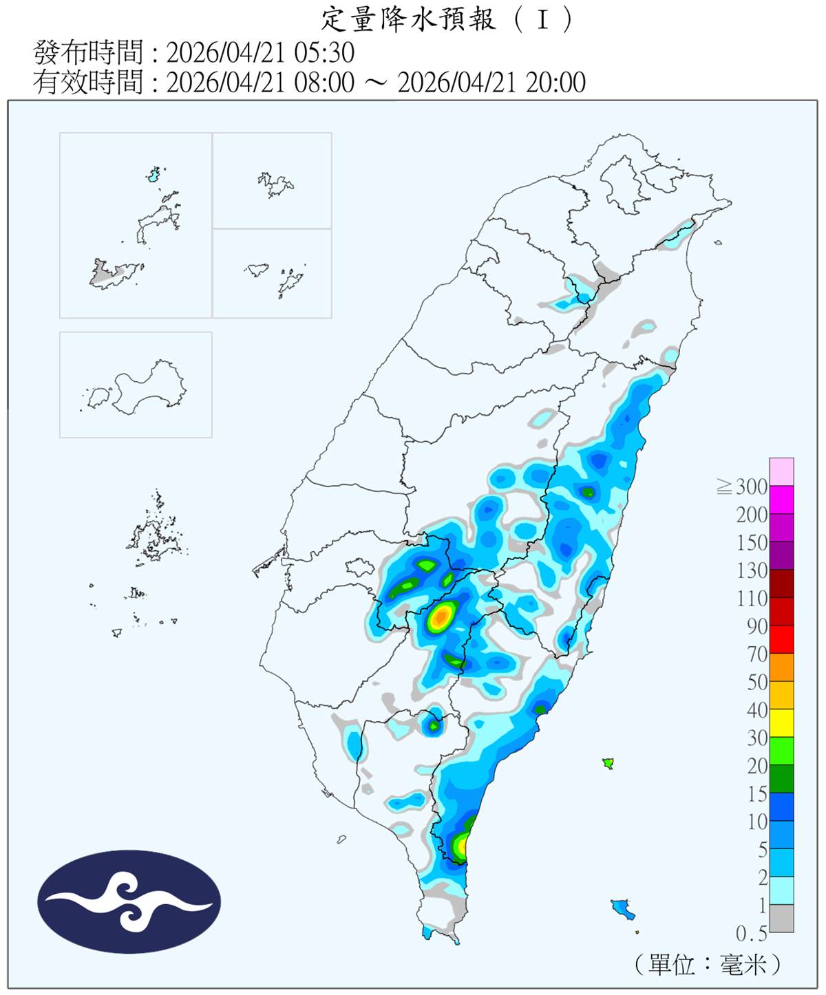 吳德榮進一步指出,週五(24日)鋒面持續南移,降雨范圍由北往南擴大,各地陸續出現局部性雷陣雨。到了週六(25日)仍持續受鋒面影響,全臺都有機會出現局部性雷陣雨,這段期間務必嚴防雷擊、強陣風及瞬間猛烈降雨。