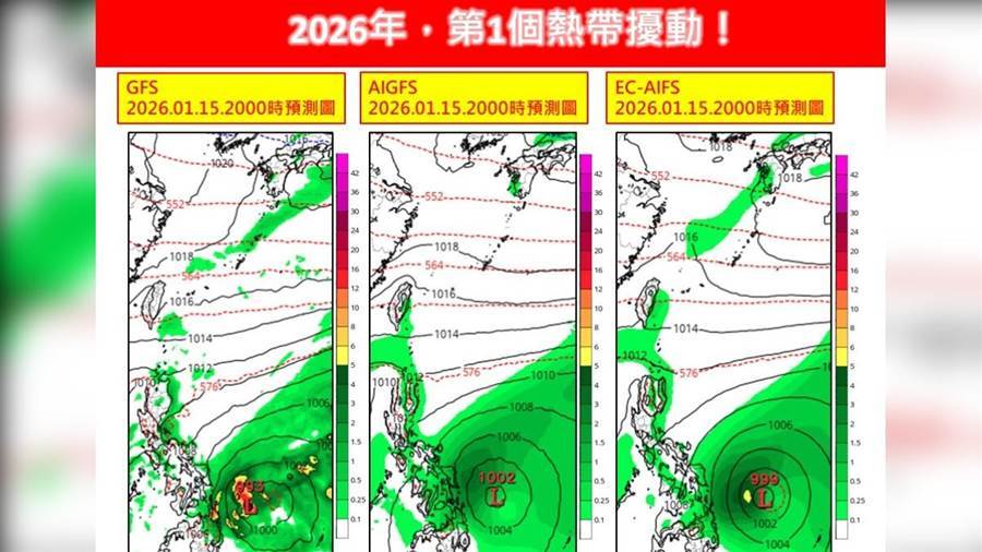 林得恩在臉書粉專「林老師氣象站」發文表示,根據美國(NCEP,AIGFS)以及歐洲(EC-AIFS)等數值模式今(12日)晨最新模擬結果均顯示,在1月15日前後,于菲島東部外海有熱帶擾動生成的訊號,且非常有可能會成為2026年的第1個熱帶擾動系統。