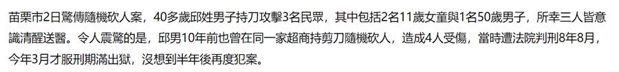 但法院認為他具殺人未遂犯意,最終依傷害罪、剝奪他人行動自由罪、殺人未遂罪,判刑8年8月定讞。如今他出獄僅半年,再度在同一地點持刀攻擊民眾,犯案情節幾乎重演,消息震驚社會。