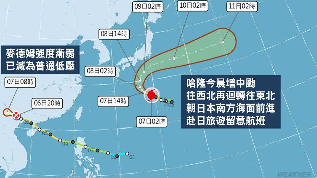 至于哈隆颱風,吳德榮表示,最新歐洲系集模式模擬圖與最新「路徑潛勢預測圖」皆顯示,「哈隆颱風」將在日本南方海面向東北東大迴轉,侵襲日本的機率並不高;雖然強度將逐漸增強,直逼強颱,但距離台灣遙遠,無影響。