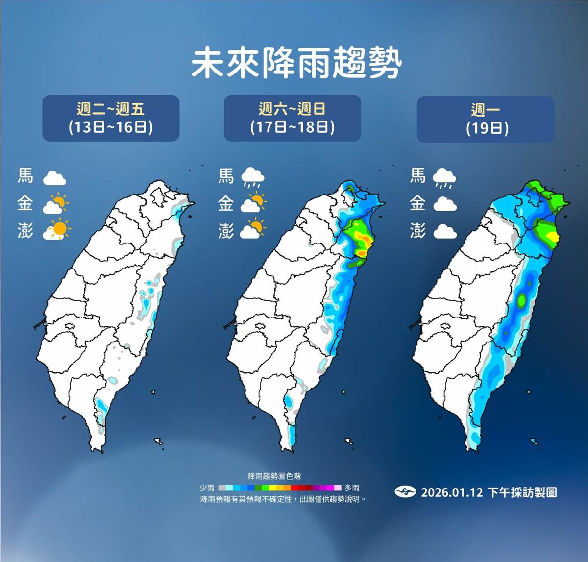 下週二至週四 (1/20~1/22)強冷空氣南下,天氣濕冷:預計是一波顯著的降溫,且帶有水氣,體感溫度會比這幾天更冷。 (相關報導: 降雨機率30%不是3成機會會下雨?教育部公布正確意思,網友全大讚「長知識了」 | 更多文章 )