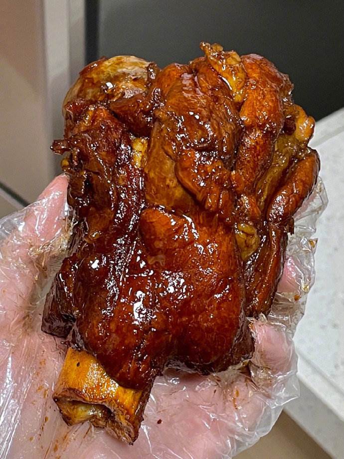 5、加完鹽后繼續蓋上蓋子,再次小火慢燉半小時,接著一小時后揭開鍋蓋,大火把湯汁收汁粘稠就可以出鍋啦。然后一手抓著,一手拿瓣蒜,吃著太解饞太香啦。
