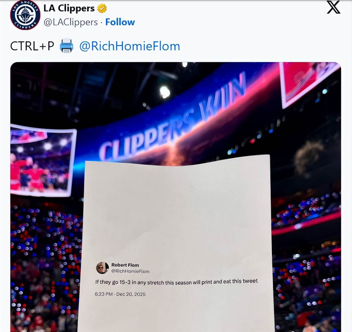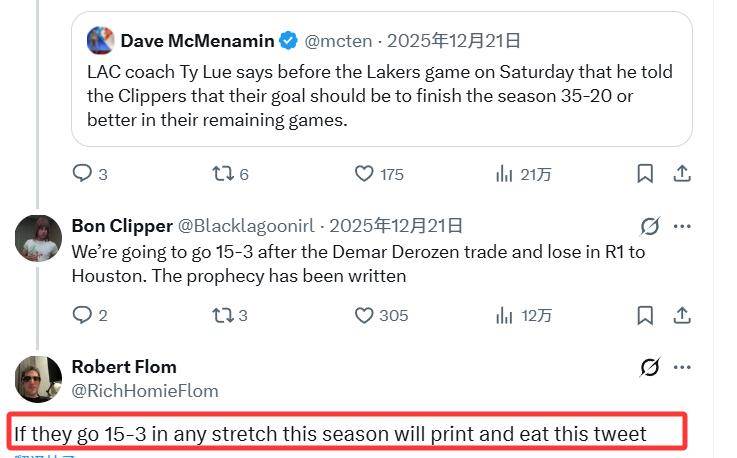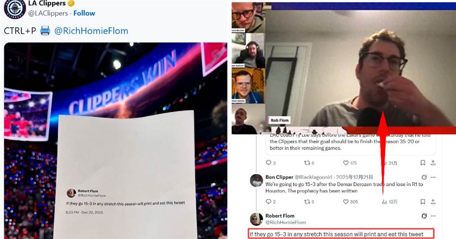 這件事的起因還要追溯到一個多月前,快船主帥泰倫-盧曾在12月21日表示,他向球隊提出了剩余賽程拿下35勝20負的目標。彼時,快船的戰績僅為6勝21負。弗洛姆當時在社媒上回應盧的這一目標時寫道:「如果快船本賽季能打出一波15勝3負的戰績,我就把這條推文打印出來吃掉。」