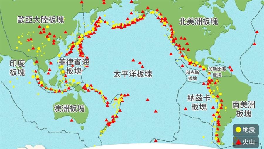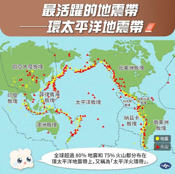 氣象署在臉書粉專「報地震 - 中央氣象署」發文說明,環太平洋地震帶除了是全球3大主要地震帶中最活躍的,全球75%的火山也分布在此,因此也被稱作太平洋火環帶。此地帶的成員多已聚合型板塊為主,板塊間會不斷推擠、隱沒到相鄰板塊的交界處,深度約100至150公里處部分會熔融成巖漿,向上溢出表面後即成海底火山,綠島、蘭嶼就是海底火山噴發所形成的火山島。