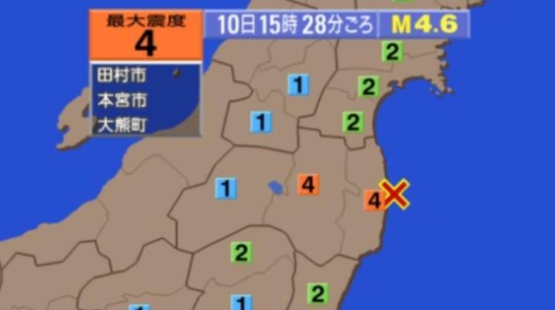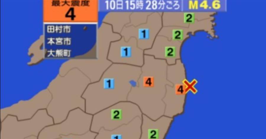日本福島縣爆發地震!當地時間今(10)日下午3時28分(台灣時間14時28分)左右,福島縣沿海發生規模4.6地震,震源深度60公里,最大震度4,日本氣象聽指出,此次地震無引發海嘯之虞。根據《NHK》地震資訊,最大震度4出現在福島縣的田村市、本宮市及大熊町。震度3地區同樣集中在福島縣,包括郡山市、白河市、須賀川市、二本松市、鏡石町、天榮村、泉崎村、石川町、玉川村、平田村、淺川町、古殿町、小野町、磐城市、廣野町、楢葉町、川內村、雙葉町、浪江町、葛尾村及新地町等地。