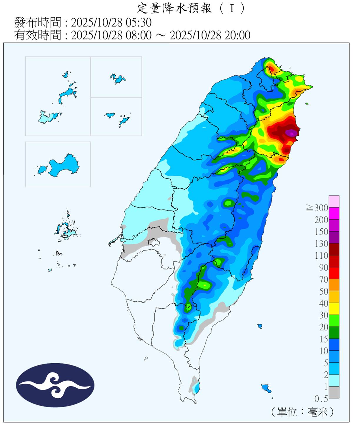 氣象署表示,今(28)日受東北季風與華南雨區東移影響,基隆北海岸、大台北山區、宜蘭有大雨或豪雨。週四(30日)東北季風減弱,是本週全台天氣最好的一天,但週五(31日)起新一波東北季風報到、雨勢再起,週末(11/1至11/2)北部低溫將跌破20度。