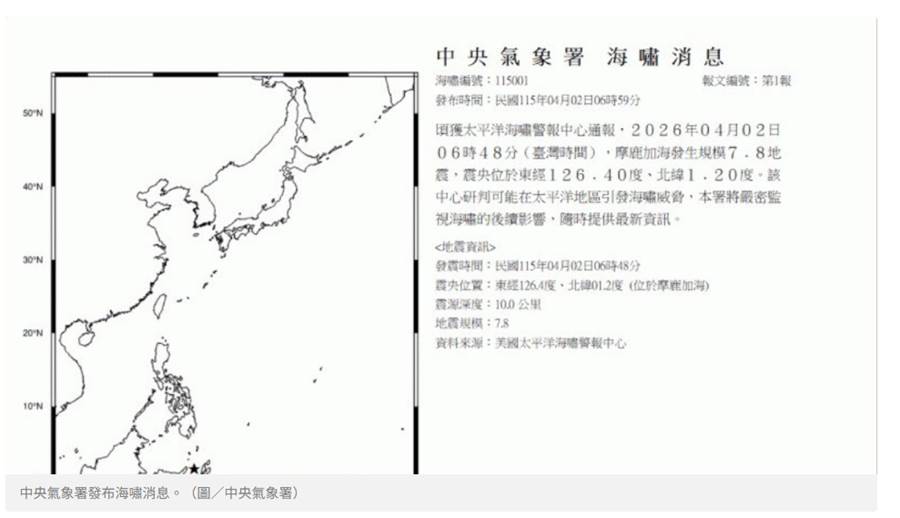 美國國家海嘯預警中心(NWS/NOAA)隨後發布海嘯威脅訊息,指出這起地震可能對印尼、菲律賓與馬來西亞構成潛在海嘯威脅,相關警報于當地時間上午6時56分左右發布。NOAA資料顯示,這起地震震央座標為北緯1.2度、東經126.4度,位置就在摩鹿加海海域。