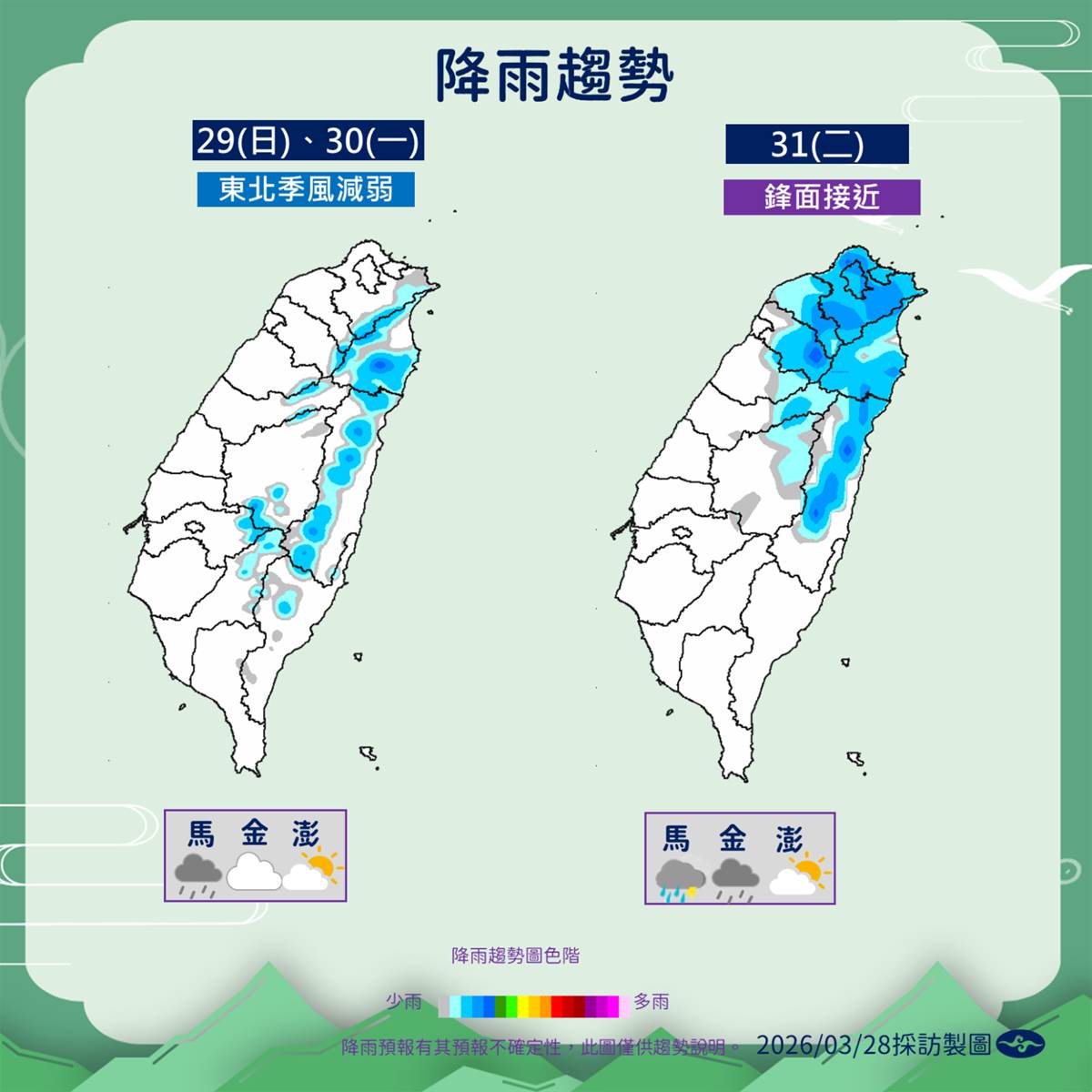 張承傳也提醒,31日鋒面接近,北部、東北部有區域性短暫陣雨或雷雨,其他地區多雲到晴,午後山區區域性短暫雷陣雨;4月1日鋒面透過、東北季風稍增強,中部以北及東北部會有短暫陣雨或區域性雷雨,其他地區區域性短暫陣雨,而中部以北清晨至上午可能有區域性較大雨勢。