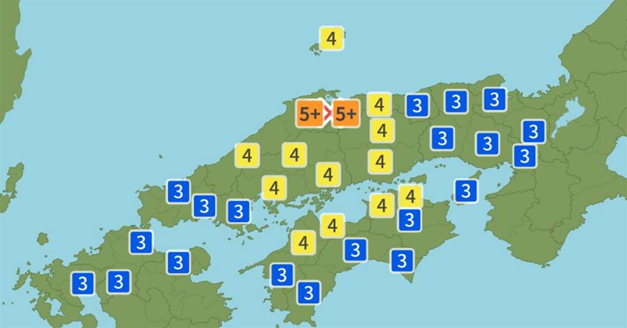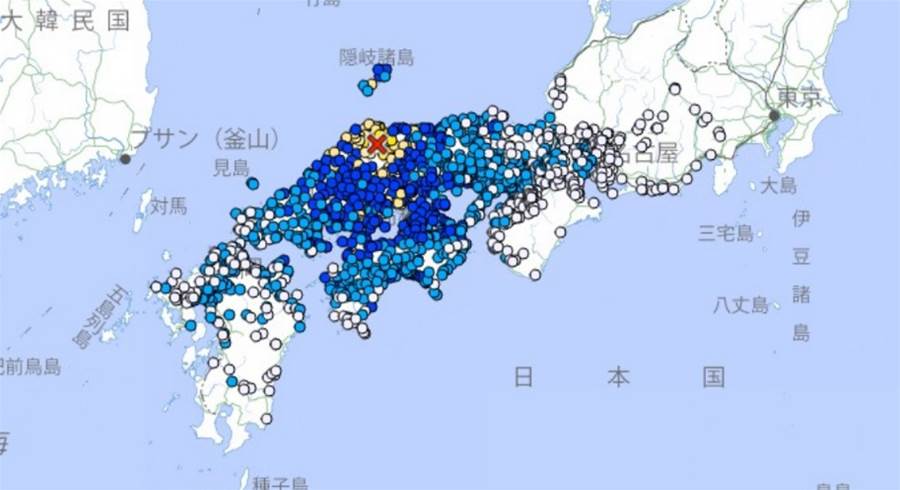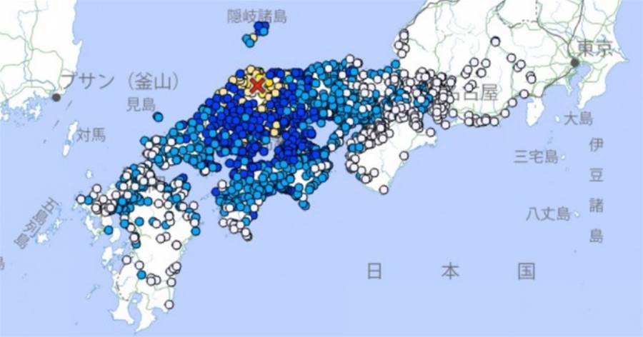 根據日本氣象廳資訊,島根縣東部在當地時間上午10時18分許,先是發生深度10公里、規模6.2、最大震度5強的地震,之後接連發生規模4.5、5.1、3.8、5.4、3.4、3.6,最大震度3、5弱、2、4、1、2級的地震,在短短半小時內,同一地點總計發生7起有感地震。