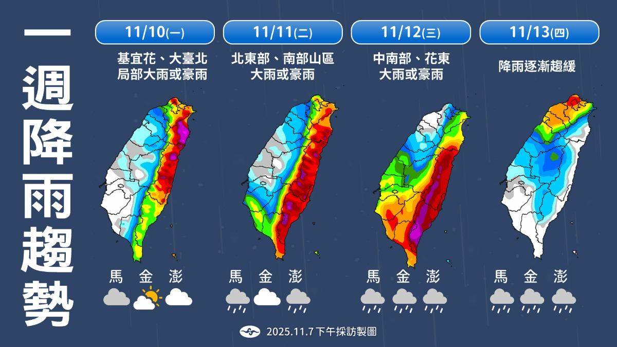 天氣風險提到,週末大氣環境無明顯變化,明(8日)晨間各地低溫約20至21度,各地普遍晴到多雲,東半部及山區附近偶有零星降雨,高溫達26至28度,而西半部白天高溫可達30度,中南部可能到32至33度。週日(9日)中午過後東北季風逐漸南下,晚間起大台北、東半部至恆春半島地區陸續轉為明顯陰雨天氣,氣溫也將逐漸下降。