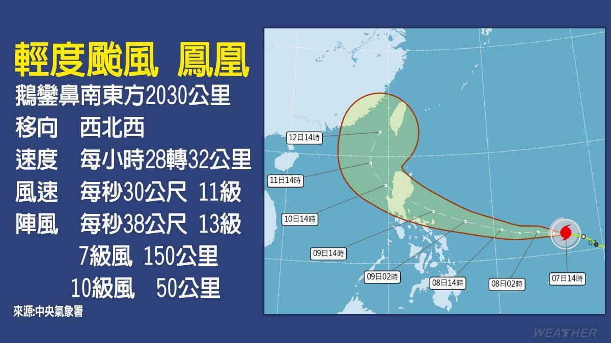 天氣風險表示,鳳凰颱風預估下週一(10日)會通過呂宋島,外圍環流與東北季風將交互作用,處于迎風面的北部、東半部須嚴防豪大雨,全台各地有出現強陣風的機會。晚間發布海上颱風警報機會高,各地可能納入警報范圍,中心有機會登陸。