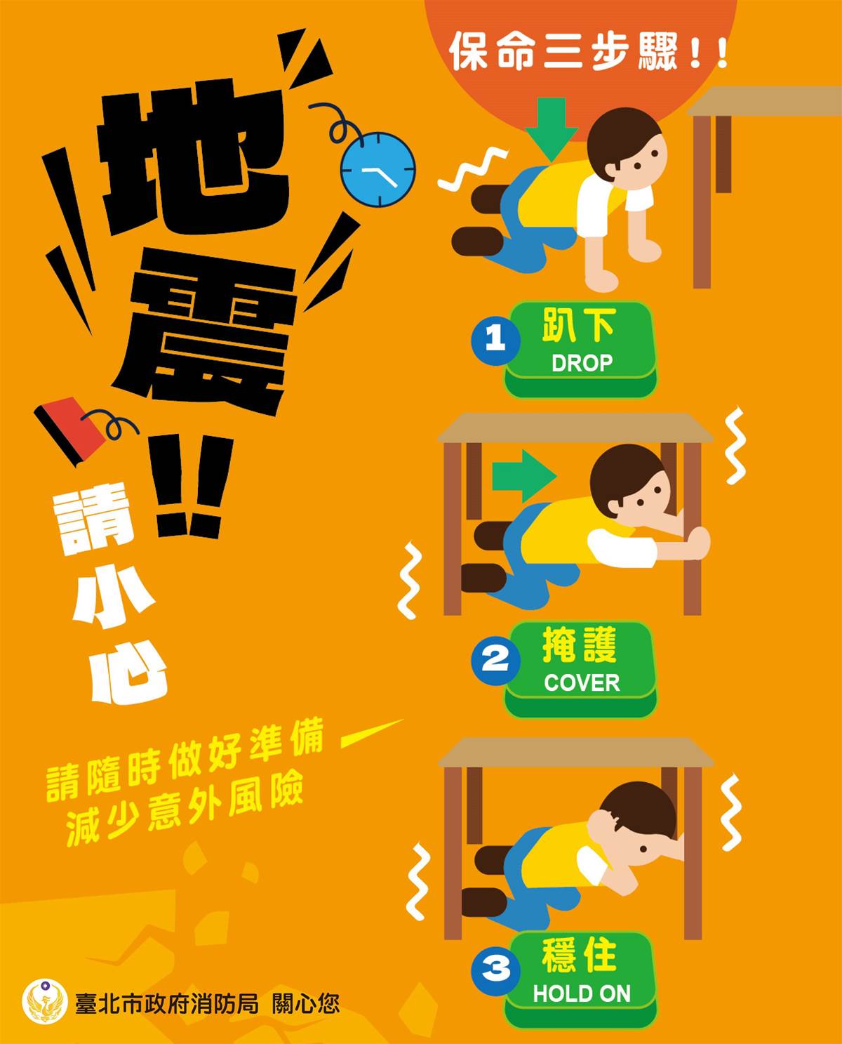 趴下、掩護、穩住:躲在堅固桌子下,抓緊桌腳,保護頭部與頸部。