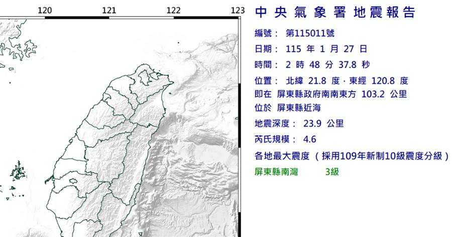 最新消息,根據中央氣象署的資訊,今(27日)凌晨2點48分,在屏東縣近海,屏東縣政府南南東方 103.2 公里處,發生芮氏規模4.6、深度23.9公里的極淺層地震,最大震度3級,無傷亡災情傳出。