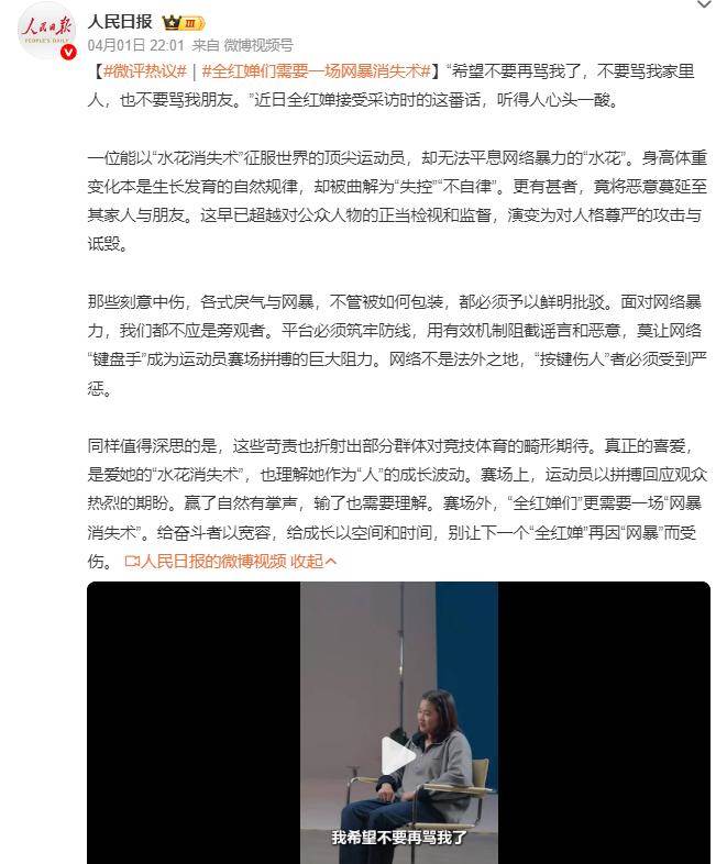 2026年3月31日,「人民銳評」直接點名全紅嬋。