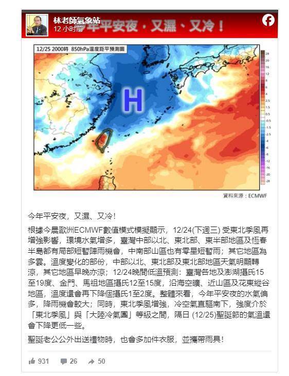 台大大氣科學博士林得恩在臉書粉專「林老師氣象站」中補充,根據歐洲ECMWF數值模式模擬顯示,平安夜當天受東北季風再增強影響,環境水氣明顯增多,中部以北、東北部、東半部地區及恆春半島都有局部短暫陣雨機會,中南部山區也有零星降雨,其他地區為多雲。溫度變化方面,中部以北、東北部明顯轉涼,其他地區早晚亦涼。平安夜晚間低溫預測,台灣各地及澎湖15至19度、金馬地區12至15度,沿海空曠、近山區和花東縱谷地區,溫度還會再降低1至2度。
