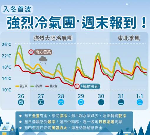 氣象報馬仔指出,中南部地區日夜溫差恐擴大至10度左右,白天偏暖、夜晚轉冷,反差顯著。