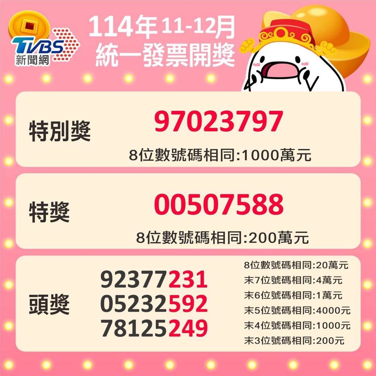 114年11-12月期統一發票開獎,本期千萬特別獎獎號為「97023797」,獎金200萬元的特獎號碼為「00507588」。全聯開出1張特別獎及2張特獎,特別獎開在臺中大智門市,中獎者消費607元購買蔬果、鮮乳、泡麵等商品,即獲得特別獎1,000萬元。