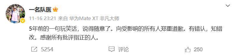 2021年7月29日,東京奧運會乒乓球女單半決賽,當時年僅20歲的孫穎莎以4:0的比分干凈利落地擊敗了日本選手伊藤美誠,為中國女乒提前鎖定金牌掃清了最大障礙,就在這場比賽結束后,這位隊醫在相關報道下留言寫道:「你已贏得了你人生中最重要的一場比賽,可以輸給陳夢了。」并配上了一個偷笑的表情;這條評論在當時并未引起太大反響,但隨著全運會「VR觀戰事件」的曝光,它被重新挖掘出來,迅速引發網友熱議,面對輿論壓力,隊醫終于在今年11月公開發文道歉:「5年前的一句玩笑話(準確而言是4年前,因為2020東京奧運會延期了1年),說得隨意了。向受到影響的所有人鄭重道歉,有錯認,知錯改,感謝所有批評指正的人。」