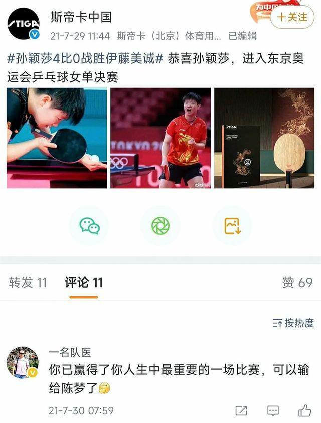 一位隊醫的社交媒體評論,在沉寂五年后,突然被推上輿論風口浪尖,全運會期間,陳夢的山東隊隊醫因「VR觀戰事件」成為焦點,隨后被網友扒出他在2021年東京奧運會期間的一條爭議評論;當時,孫穎莎剛剛在半決賽以4:0橫掃日本選手伊藤美誠,為國乒女單掃清奪冠障礙后,而這位隊醫卻寫道:「你已贏得了你人生中最重要的一場比賽,可以輸給陳夢了。」并配上一個偷笑的表情,那麼如今時隔4年,該隊醫正式向孫穎莎道歉