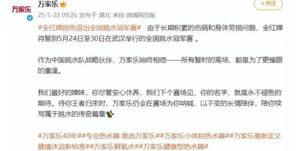 2025年5月,全紅嬋因腳踝舊傷復發、骨膜炎等問題,官宣退出全國跳水冠軍賽。